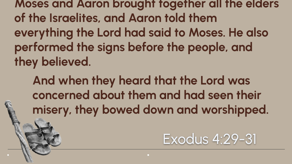 How beautiful! The people believe Moses and Aaron. They hear God’s promises and see the signs of His power. Then they bow down and worship God! Everything is going so well.