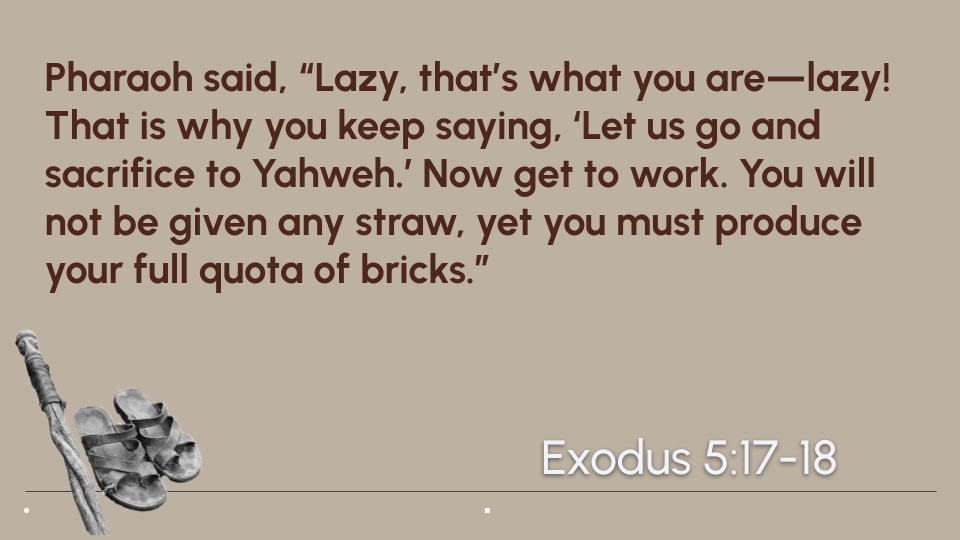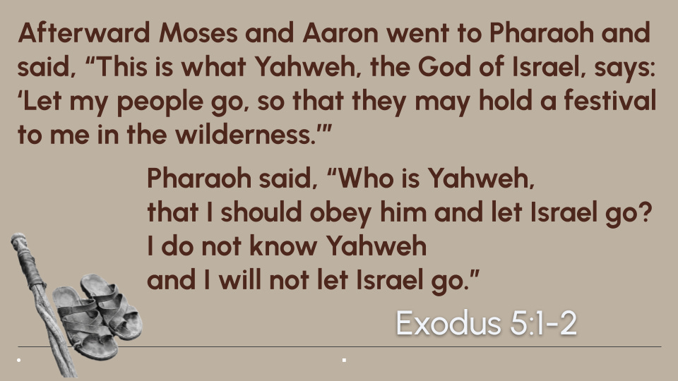 Uh oh! Sure, they didn’t expect Pharaoh to worship Yahweh. But the momentum was with them. They expected him to at least let them have their festival. But Pharaoh said no. So, Moses and Aaron repeat their demands. Pharaoh is not impressed. Then, Pharaoh realises what the problem is.