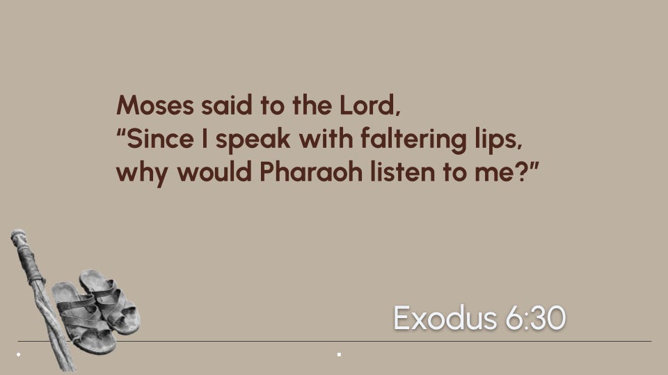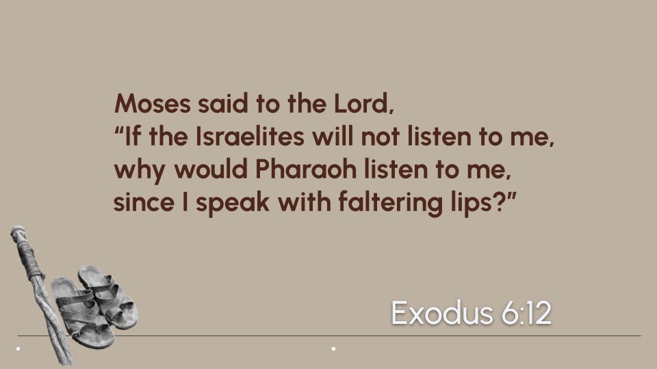 Moses has two final statements in chapter 6. First, in Verse 12, after God tells him to go back to Pharaoh.