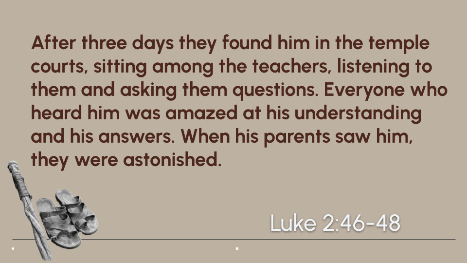 It was the first year he was old enough to go with his parents to Passover. When the week of celebration was over, his parents headed home with a group from Nazareth. They walked all day, and only realised at bedtime that Jesus was not with them. The next day, they walked back.