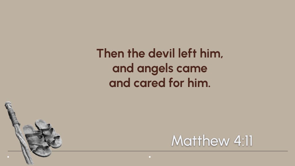 Satan spent all that time trying to trip Jesus up by challenging him to prove that he is the Son of God, and ironically, that’s exactly what Jesus does by resisting the Devil - he demonstrates his Divine nature. Matthew smiles and writes the end of Jesus’ desert story.